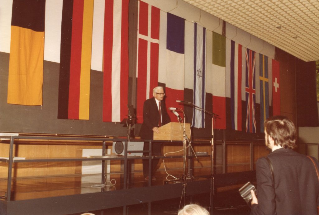 Sir John Kendrew at the opening ceremony in the auditorium of the Max-Planck-Institut für Kernphysik, From the EMBL Archive. Frieda Glöckner material, DE 2324 P-GLO-B-1
