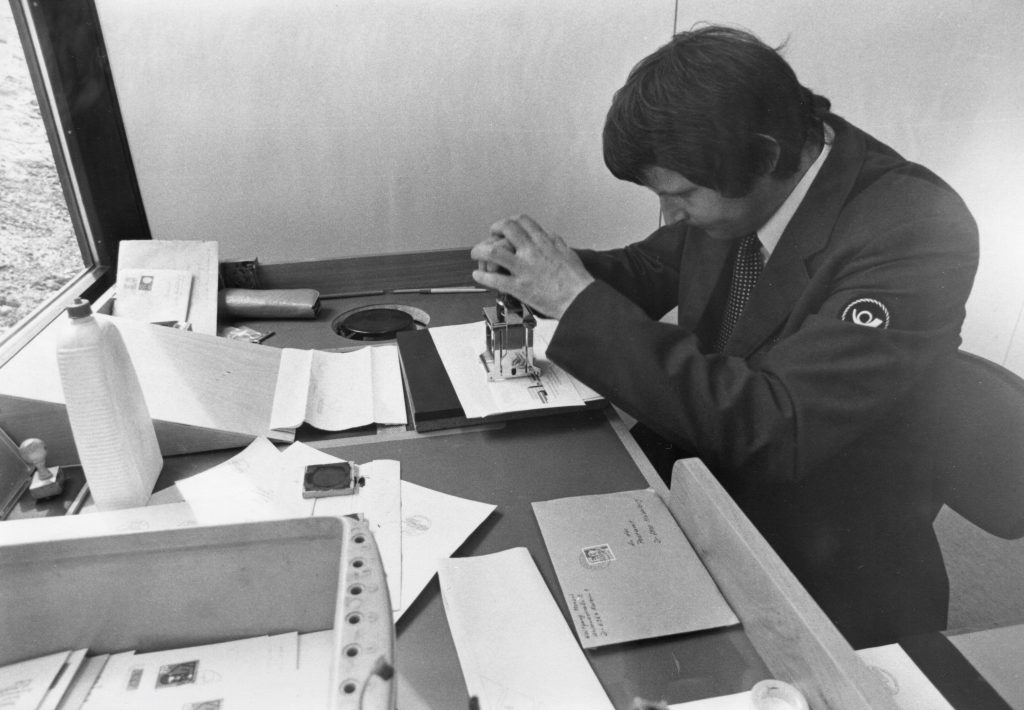 A post officer stamps specially designed envelope on the inauguration day of the Laboratory. From the EMBL Archive, Frieda Glöckner material, DE 2324 P-GLO-B-1