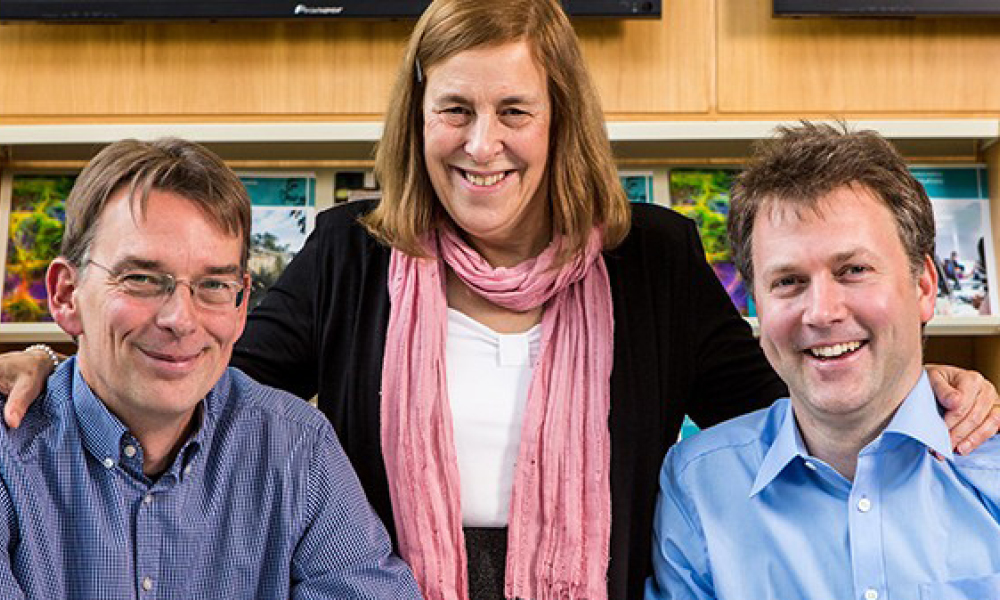 (L-R) Rolf Apweiler, Janet Thornton, and Ewan Birney in 2015. Credit: Jon Mold/EMBL