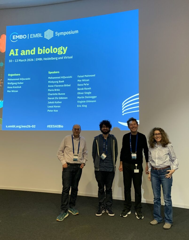 Riccardo with the Scientific organisers: Mohammed AlQuraishi, Wolfgang Huber, and Anna Kreshuk