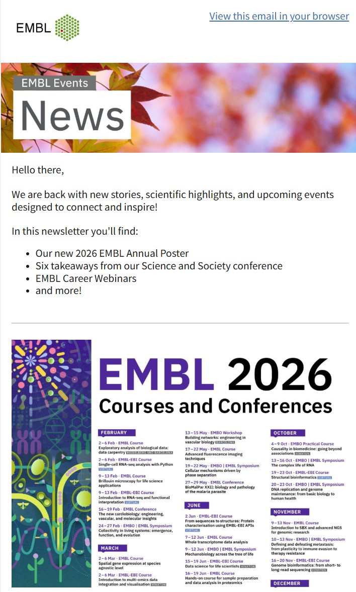Our quarterly EMBL Events e-newsletter delivers the latest information on events taking place at EMBL Heidelberg and its sites in Hinxton (European Bioinformatics Institute), UK, Grenoble, France, Hamburg, Germany, Rome, Italy and Barcelona, Spain.