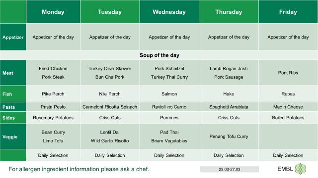Canteen Table Reservation: Please be aware, that table reservations will be only available from 12:45 to 13:30. To make a reservation, please do not hesitate to contact us via mail at catering@embl.de