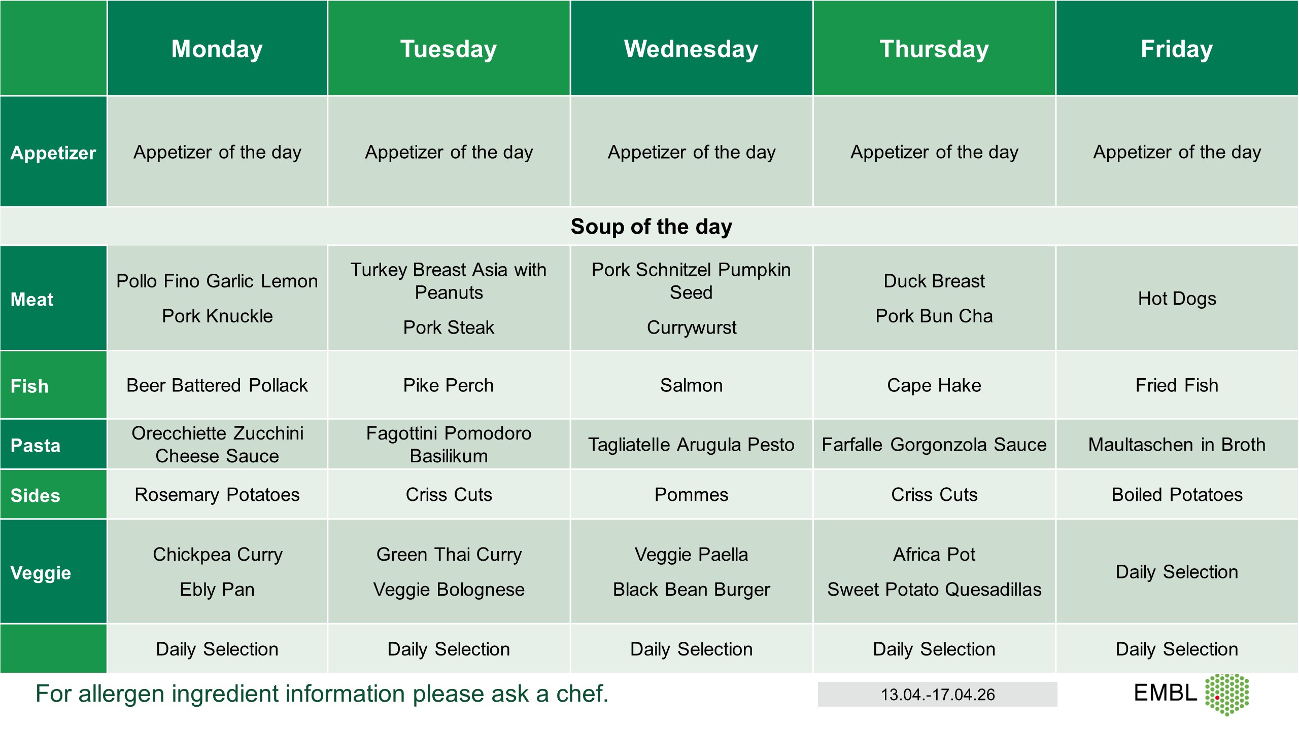 Canteen Table Reservation: Please be aware, that table reservations will be only available from 12:45 to 13:30. To make a reservation, please do not hesitate to contact us via mail at catering@embl.de