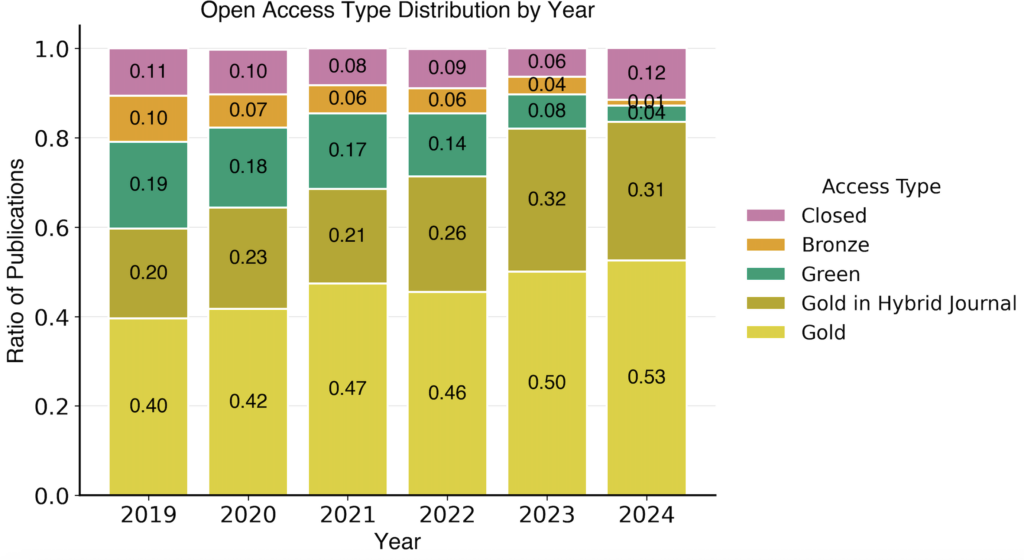Open Access type distribution trends for EMBL-led papers from 2019 to 2024.