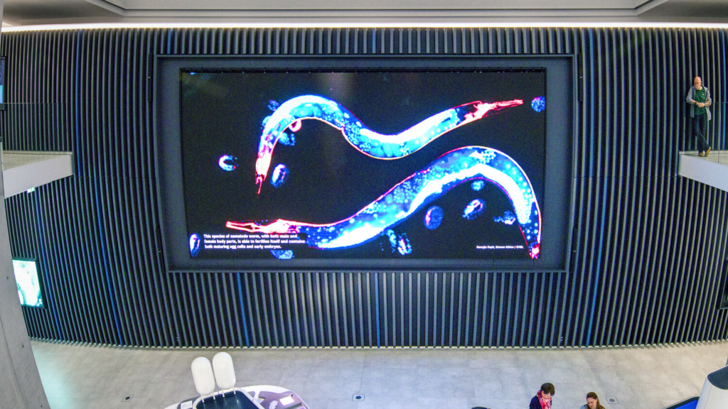 At the centre of our exhibition is the 40 m² LED wall—our “Window of Wonder”—where microscopy images can be experienced in their full beauty. This year, we are refreshing the display through the WoW Award: EMBL scientists, along with external collaborators, have submitted their best microscopy images for the chance to be featured.