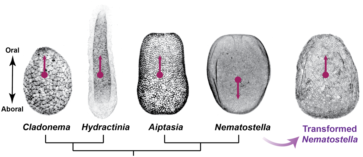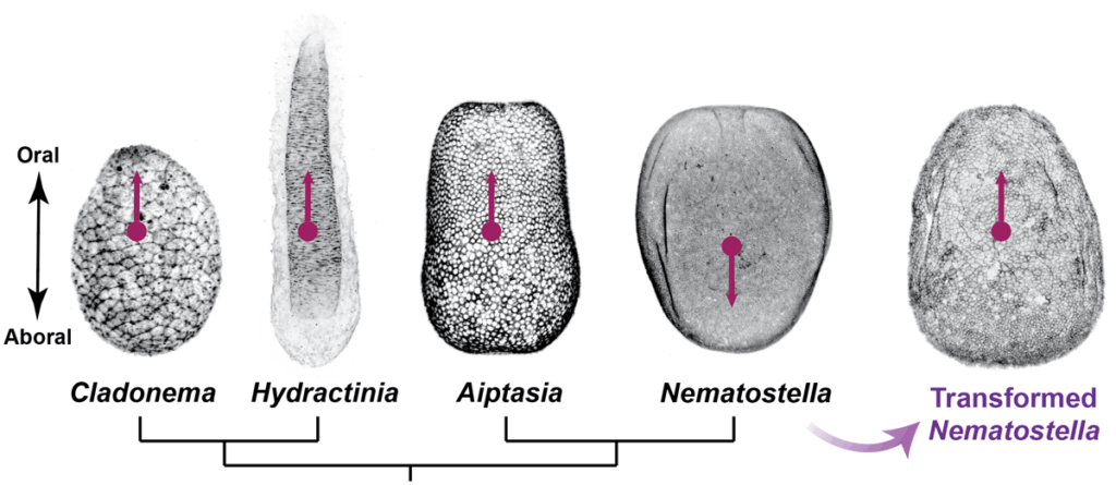 We use cnidarian model systems—including sea anemones, jellyfish, and corals—which offer exceptional access to life-cycle plasticity, regeneration, and whole-body imaging. By combining precise genetic perturbations (including CRISPR/Cas9 tools we pioneered in a sea anemone), quantitative live imaging (Movie 1), and biophysical approaches, we aim to identify general design principles underlying morphogenetic robustness and plasticity. Comparative analyses across species (Figure 1) further allow us to assess how these processes are tuned over evolutionary time.