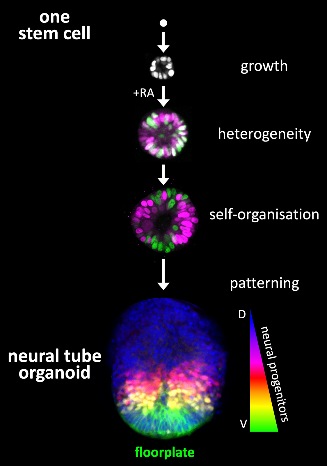 In mammals, the mechanisms by which self-organisation contributes to development are challenging to study, due to the embryo’s complexity and in utero location. In vitro stem cell models (organoids, embryoids) can spontaneously break symmetry and create patterns of cellular differentiation, allowing deconstruction and reconstruction of developmental mechanisms in a controlled setting. We use neural tube organoids (NTOs) (Figure 1) to study principles of multicellular self-organisation and as a basis for tissue engineering. The neural tube is the embryonic precursor of the brain and spinal cord. Starting from a single cell, mouse NTOs form 3D tissues that recapitulate the highly conserved pattern of neural progenitors and neurons critical for central nervous system form and function (Figure 1).