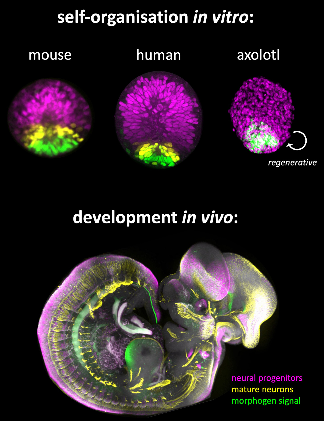 Our goals are to understand how the self-organising properties of stem cells contribute to the robustness of vertebrate development and regeneration, and to deconstruct the interaction between self-organisation and context. We employ an interdisciplinary approach, integrating advanced stem cell manipulation, mammalian and amphibian neural organoids, computational modelling, embryology, and bioengineering.