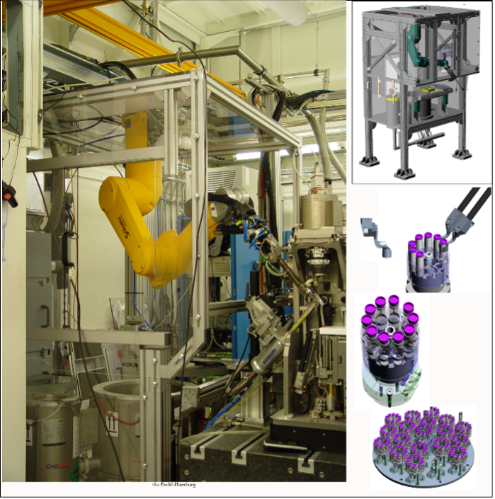 The “MARVIN” sample changing system is available for the transfer of samples from storage to the diffractometer for imaging, and is controlled via the MXCuBE interface. The storage has a capacity of 17 pucks, i.e., up to 170 samples.