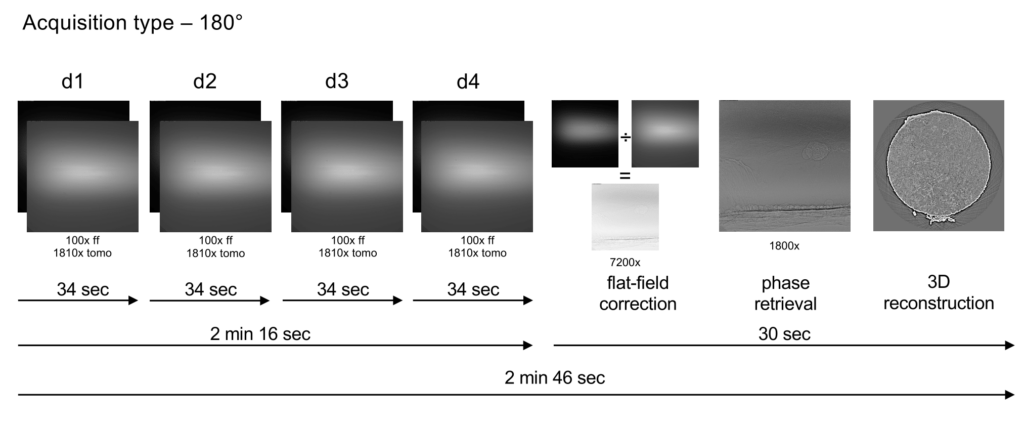 The acquisition protocol consists of acquiring a tomographic dataset of the sample at each of four different sample-camera distances. Phase retrieval from this data is performed using the “holotomography” approach, after which tomographic reconstruction is performed.