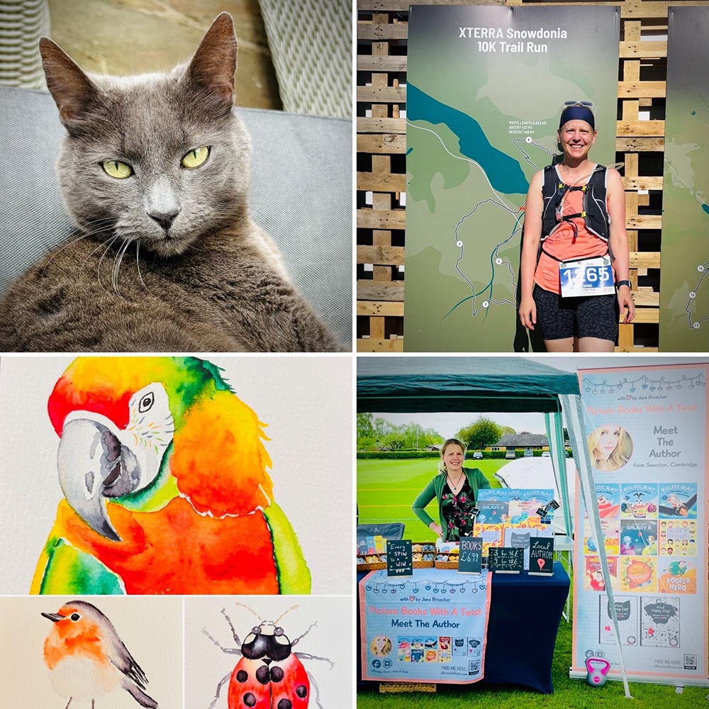 A collage of Jana Broecker’s hobbies and interests, including her cat Boris, watercolours, trail runs and writing children’s books.