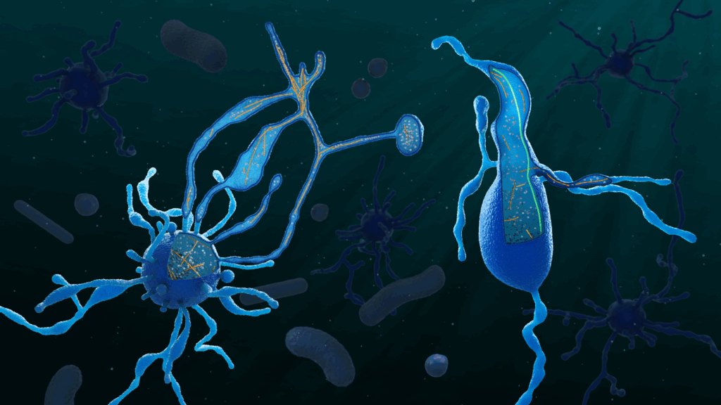 Cryo-ET is an amazing technique precisely because it bridges these two disciplines: we can simultaneously visualise cellular ultrastructure (nowadays even in very complex systems, such as tissues) and do in situ structural biology – this means, in an ideal case, we can look at protein structures within their native cellular environment. This is obviously a very useful resolution range to bridge within the same sample. Importantly for us, we do not depend on genetics, so we can study cell biological mechanisms even in non-model organisms, which constitute most of life on Earth. At the same time, cryo-ET still has its limitations, both in resolution and throughput. While it’s a great discovery tool that allows us to ‘just look’ at biology, it is still relatively low-throughput and not always ideal for quantitative analyses.